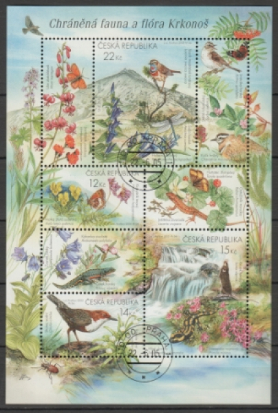 Mi.-Nr.: BL 23 / Geschützte Tiere und Pflanzen / 12,- Kč Sudeten Veilchen + Alpen - Süßklee ● 14,- Kč Wasseramsel + Märzenbecher ● 15,- Kč Feuersalamander + Zwergprimel ● 22,- Kč Enzian + Alpen - Mosaikjungfer + Rotstern - Blaukehlchen Ersttagsstempel