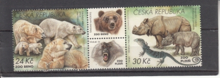 Mi.-Nr.: 936 + 2 ZF + 937 / Zoologische Gärten II / Ochrana přírody — Zoologické zahrady II / ZOO Brno: medvěd lední + ZOO Plzeň: nosorožec indický a varan Marke (medvěd led) + 2 ZF + Marke (nosorožec indický a varan) / waagerecht