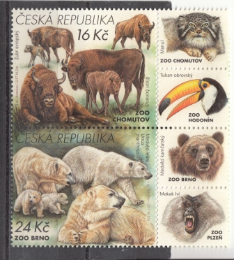 Mi.-Nr.: 934 + 0936 + 4 ZF R / Zoologische Gärten II / Ochrana přírody — Zoologické zahrady II / ZOO Chomutov: zubr evropský + ZOO Brno: medvěd lední Marke (zubr evropský) + Marke (Eisbär) + ZF R + ZF R + ZF R + ZF R / senkrecht