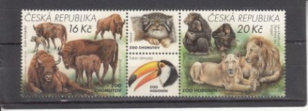 Mi.-Nr.: 934 + 2 ZF + 0935 / Zoologische Gärten II / Ochrana přírody — Zoologické zahrady II / ZOO Chomutov: zubr evropský + ZOO Hodonín: lev jihoafrický a šimpanz Marke (zubr evropský) + 2 ZF + Marke (lev jihoafrický a šimpanz) / waagerecht
