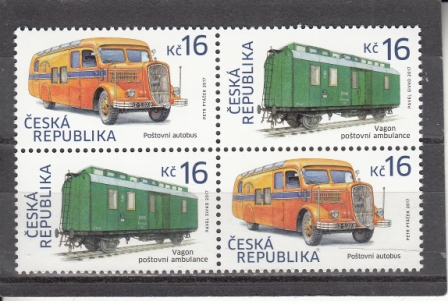 Mi.-Nr.: 0914 + 0915 + 0915 + 0914 / Historické dopravní prostředky: poštovní autobus a vagón poštovní ambulance - HISTORISCHE VERKEHRSMITTEL: POSTBUS und WAGGON DER POSTAMBULANZ