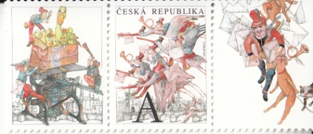 DUŠAN KÁLLA / Die Post auf Flügel "A" Mi.-Nr.: ??? / Zierfeld (D) links + Marke + Zierfeld (A) rechts