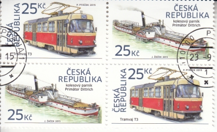 Mi.-Nr.: 0860 + 0859 + 0859 + 0860 / Viererblock / 1. Reihe: Straßenbahn T3 links + Raddampfer Primator Dittrich rechts + 2: Reihe: Raddampfer Primator Dittrich links + Straßenbahn T3 rechts / Tages- Rundstempel