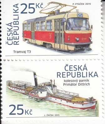 HISTORISCHE VERKEHRSMITTEL: Straßenbahn T3 + Raddampfer Primator Dittrich Mi.-Nr.: 0860 + 0859 / Paar / Straßenbahn T3 oben + Raddampfer Primator Dittrich unten - senkrecht