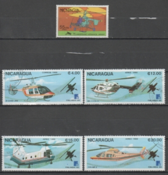 5 Stück - Zusammenstellung von gestempelten Briefmarken aus NIC Nicaragua - sestava razítkovaných známek sh. Abbildung Tages- Rundstempel (1 Briefmarke leider ohne Tagesstempel und ohne Gummi) Motiv: Beförderungsmittel / Transport / Verkehr / Flugverkehr / Flugwessen / Ballon / Flugzeug / Wasserflugzeug