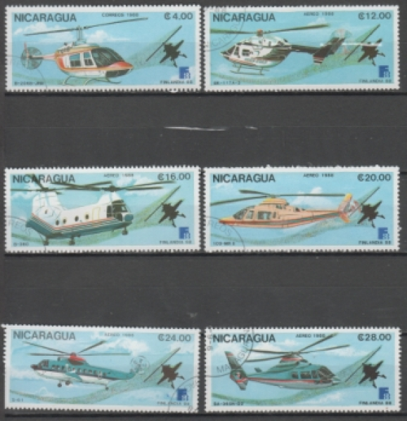 6 Stück - Zusammenstellung von gestempelten Briefmarken aus NIC Nicaragua - sestava razítkovaných známek sh. Abbildung Tages- Rundstempel Motiv: Beförderungsmittel / Transport / Verkehr / Flugverkehr / Flugwessen / Ballon / Flugzeug / Wasserflugzeug