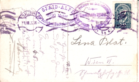 rückseitig Tagesstempel: „Salzburg 2 / 11. VIII. 20“ + Werbestempel sh. Abbildung + Wellenstempel