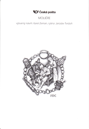 Philatelistisches Souvenir / Schwarzdruck - Entwurf zum FDC POFIS-Nr.: 1149 aus dem Jahr 2022 von Karel Zeman und Stich von Jaroslav Tvrdoň ist die Szene aus dem Spiel „Der eingebildete Kranke" abgebildet. Maße ca: 110 x 160 mm