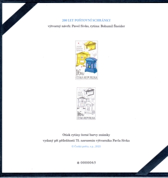 Die Česká pošta, s. p. bereitet anlässlich des 75. Jahrestages Geburtstages des Künstlers Pavel Sivko die Ausgabe eines speziellen Satzes vor. Dieser Satz besteht aus einem Gedenk-Sonderdruck mit dem Abdruck der Gravur aus der Ausgabe „200 Jahre Briefkasten “ aus dem Jahre 2017, und aus einem Gedenkblatt zum Geburtstag des Künstlers. Der Gedenk-Sonderdruck mit Abdruck von dem Kunststich von B. Šneider in schwarzer Farbe, der mit der Stahldruckmaschine WAITE angefertigt wurde, wird mit einem Begleittext ergänzt, und im unteren Teil nummeriert. Das Gedenkblatt mit der aufgeklebten Briefmarke aus dem Block, mit dem Stempel „Známková tvorba, Praha 24.1.2023“, wird gleich nummeriert, und mit einem Hologramm ergänzt.